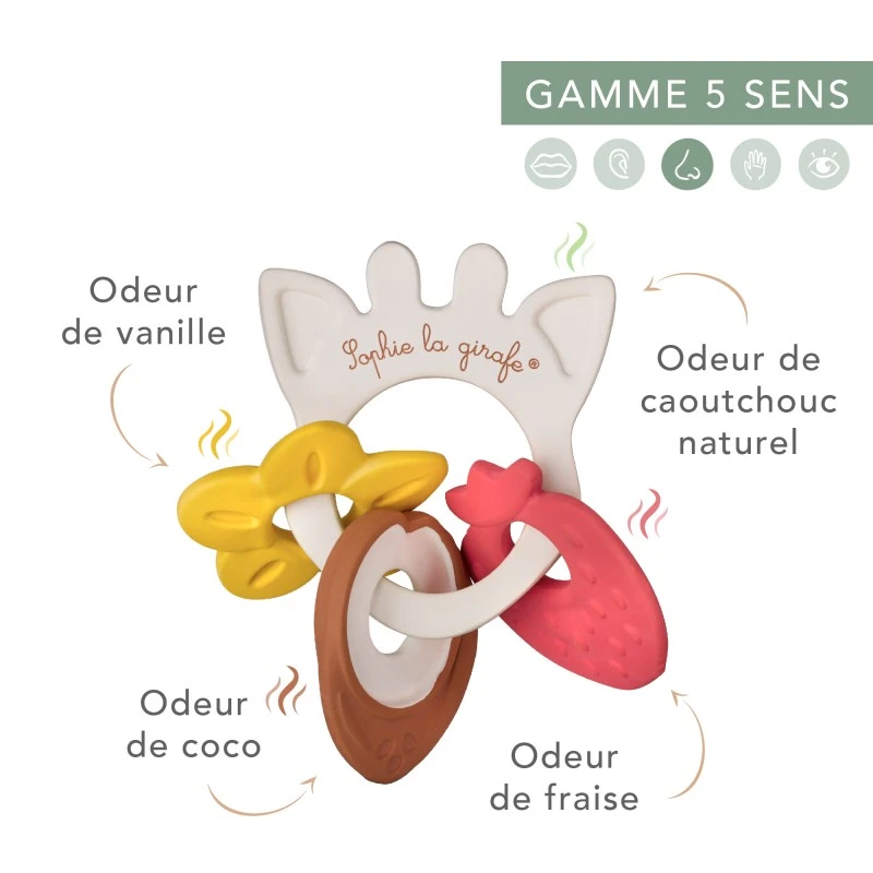 Bébé découvre et éveille son sens de l’odorat grâce aux caoutchouc naturel parfumé ! Facile à saisir et à manipuler, l’anneau senteurs se compose de 3 médaillons à la délicate odeur sucrée de vanille, fraise et coco. Subtile et légère, chacune des odeurs éveille le sens de l’odorat de bébé dès ses premiers mois et attisent sa curiosité. Ce double support, visuel et olfactif, est idéal pour stimuler le développement sensoriel des tout-petits !
