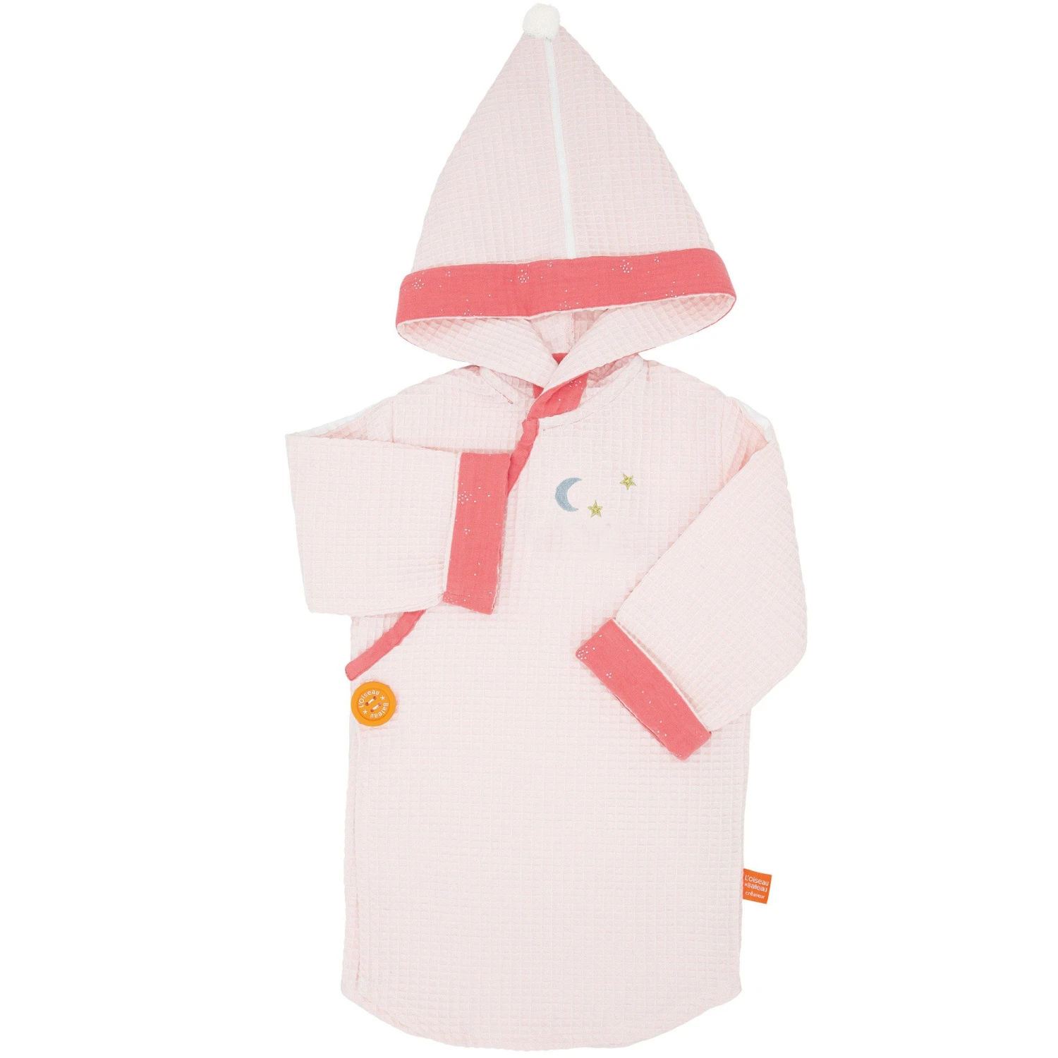 Kimono tout douillet en nid d’abeille. Il se ferme par un bouton gomme facile à manipuler pour l’enfant.