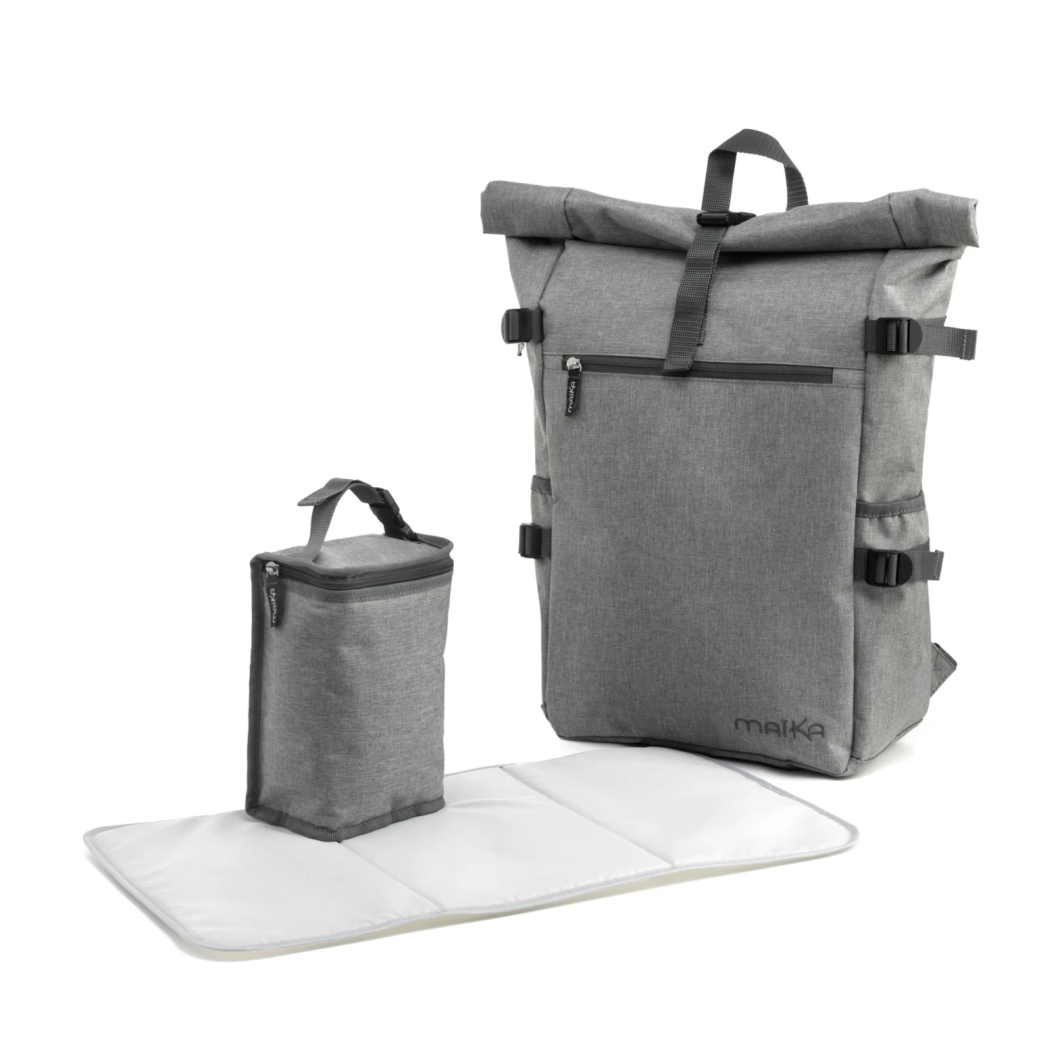 Sa forme en roll-top et ses tissus très résistants gris chiné lui confèrent un look mixte et intemporel.